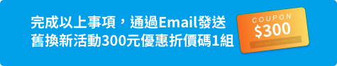 - 網路商店於購物結帳時務必將自行將折價碼填入,如未填入則無法折價300元。